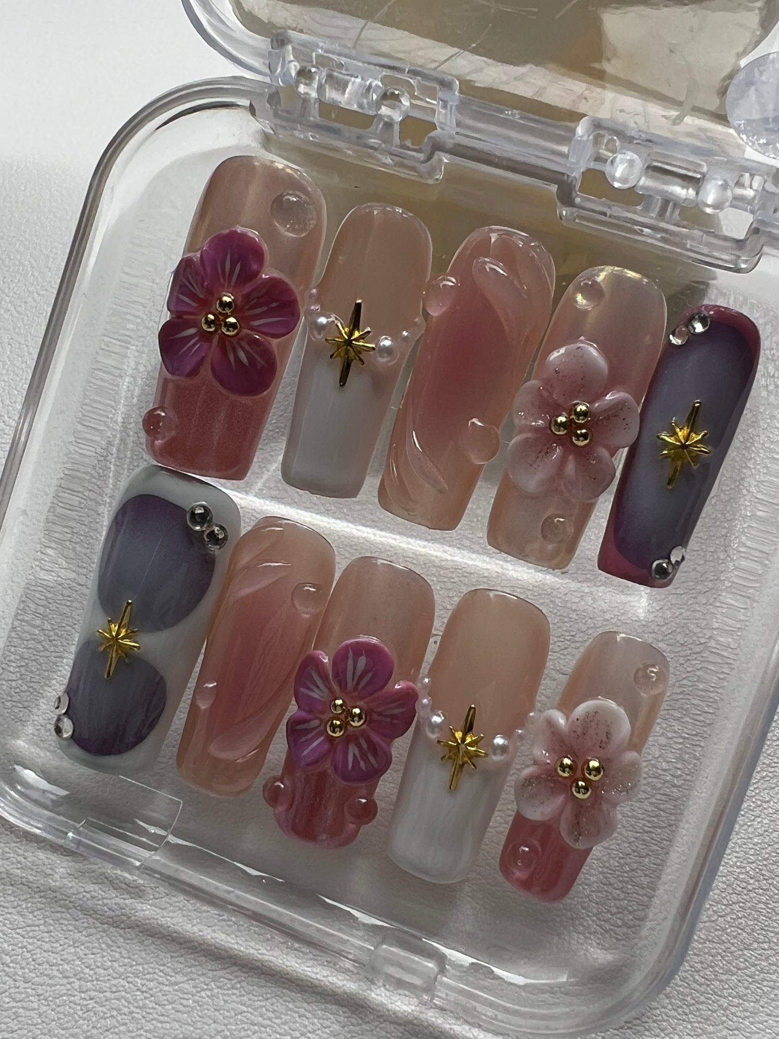 Introducing our enchantingly ethereal and whimsical press-on nail set, perfectly capturing the soft allure of spring or summer. It features a harmonious blend of delicate blush pinks, serene lavenders, and elegant nude tones, all imbued with a subtle pearlescent shimmer.