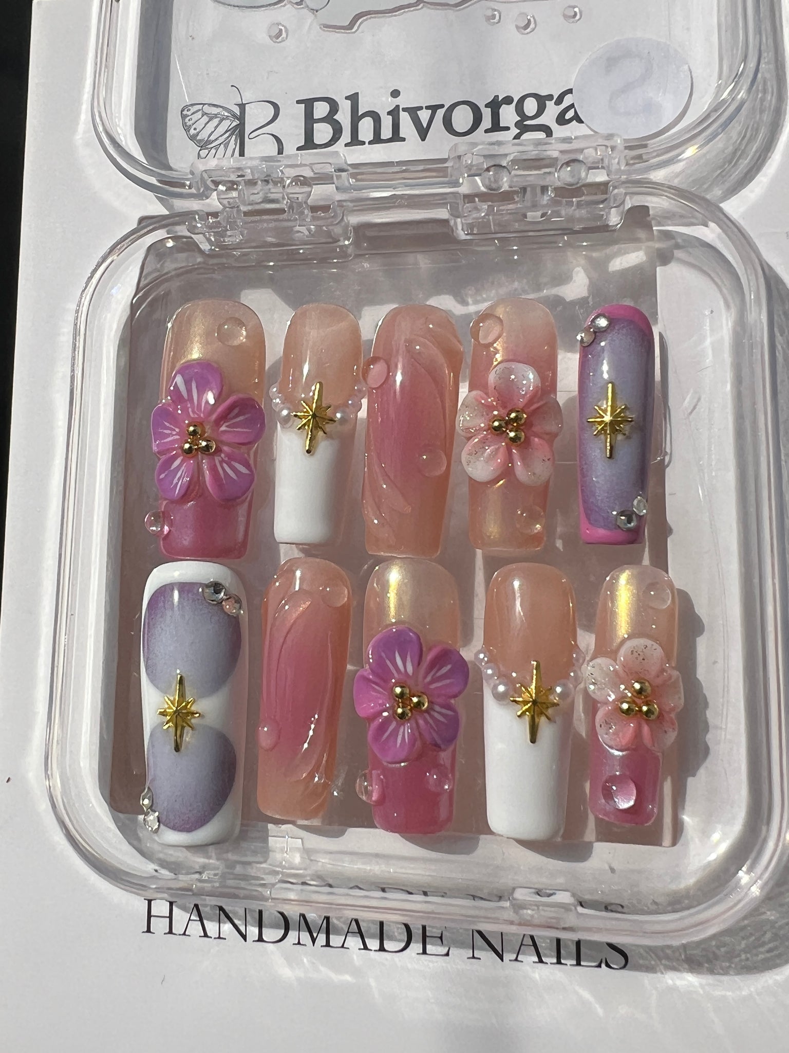 The design is adorned with exquisitely sculpted 3D floral embellishments in varying shades of pink and purple, some showcasing translucent petals and gleaming gold centers. Further enhancing its magical appeal are unique pleated textures, reminiscent of delicate fans, radiant golden star charms, and lustrous pearl accents. Accenting the ethereal aesthetic, select nails feature soft, gradient ombré transitions, adding depth and fluidity.