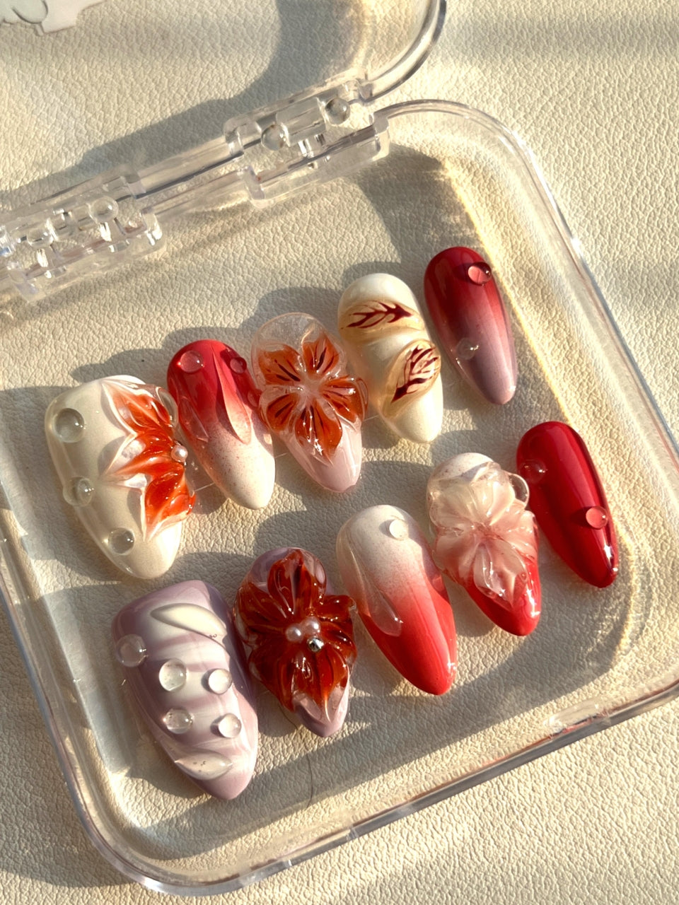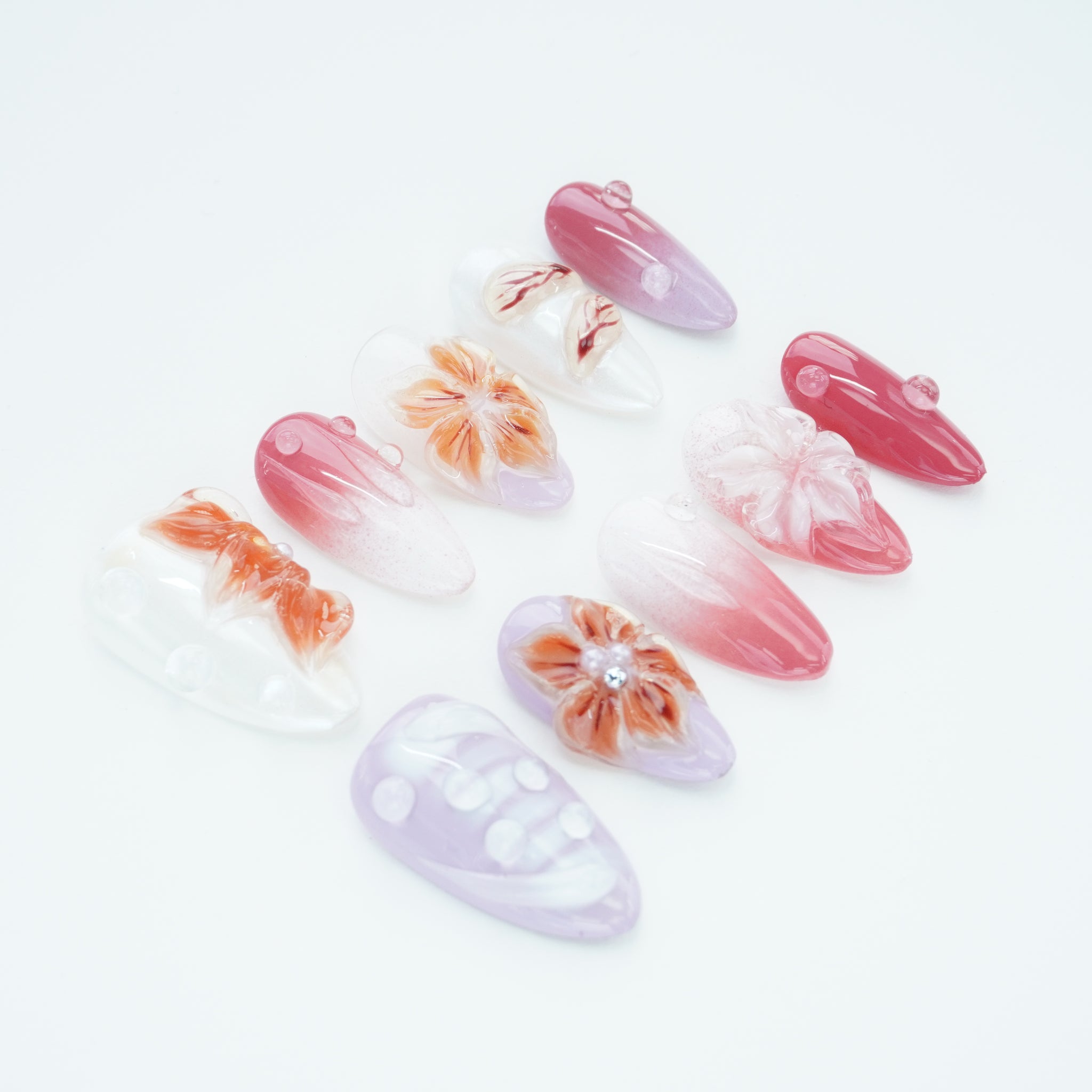 Introducing our exceptionally ethereal and romantically artistic press-on nail set, embodying a captivating gradient aesthetic. It features a harmonious blend of delicate soft pink, rich crimson red, and serene lavender purple, beautifully accented with crisp white details and translucent clear elements.