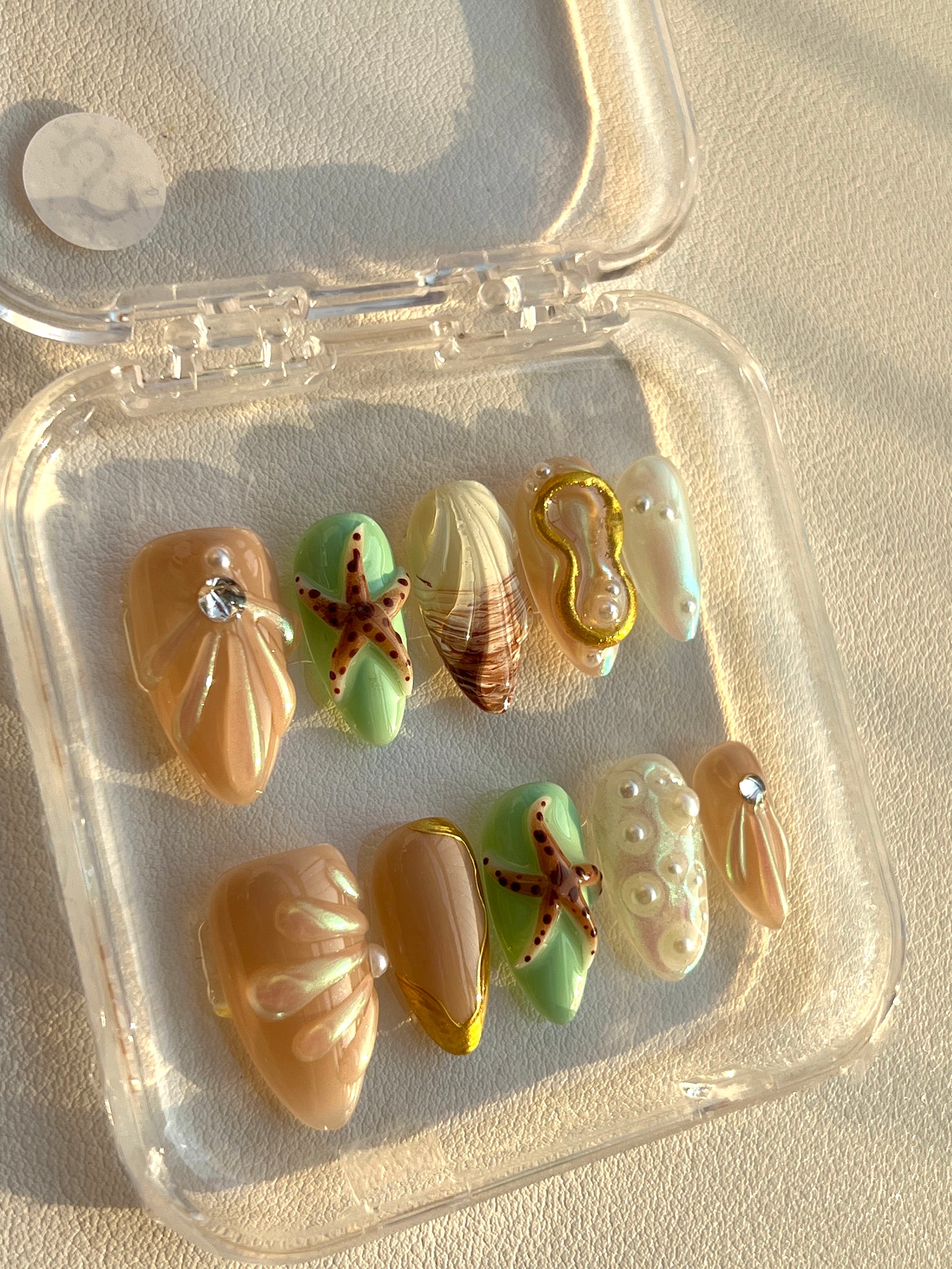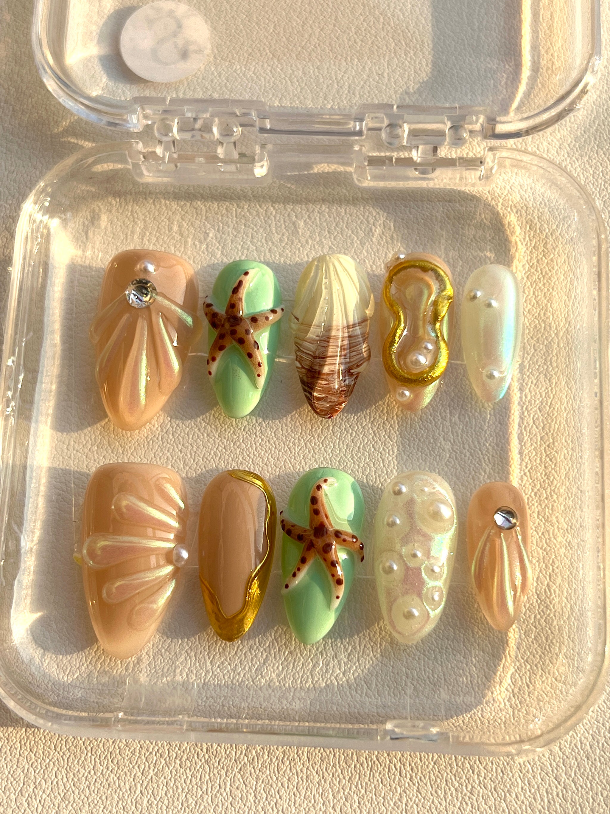 The design is meticulously adorned with exquisite 3D sculpted shell patterns that appear to ripple with natural elegance. Further enhancing its mystical allure are delicate dimensional starfish charms, and nails showcasing unique textures reminiscent of gentle ocean waves and polished pearls. Adding to the enchanting sparkle are subtle iridescent glitter details, delicate pearl accents, and sparkling gemstone embellishments.