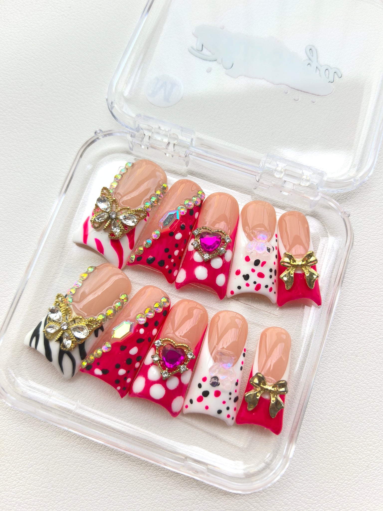 The design is meticulously adorned with luxurious 3D embellishments, including sparkling silver butterfly charms, charming delicate pink heart-shaped gems, and radiant gold bow motifs. Further enhancing its distinctive style are nails showcasing bold black and white zebra stripes, others with playful pink and white polka dots, and some in a lustrous, solid fuchsia finish.