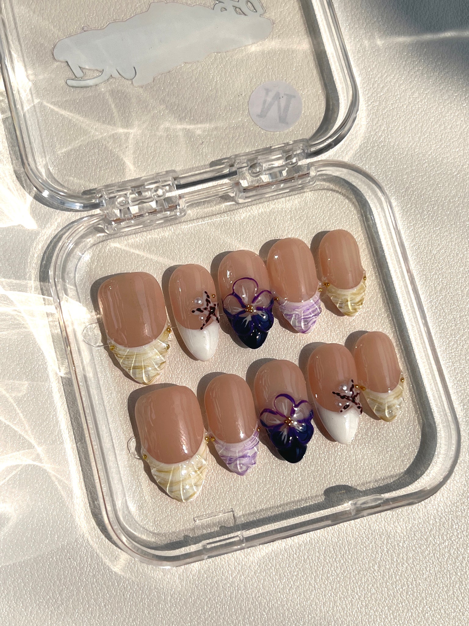 Introducing our exquisitely serene and enchanting press-on nail set, perfectly capturing the gentle beauty of a coastal spring or summer. It features a harmonious blend of delicate nude tones, pristine whites, soft lavenders, and tranquil blues.