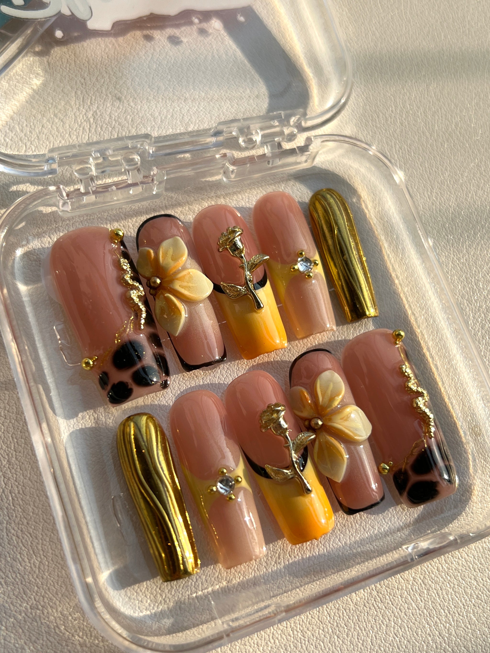 Introducing our exceptionally opulent and strikingly bold press-on nail set, designed to embody autumnal grandeur and avant-garde style. It showcases a rich fusion of creamy nude tones, radiant metallic gold, and sophisticated tortoise shell patterns.
