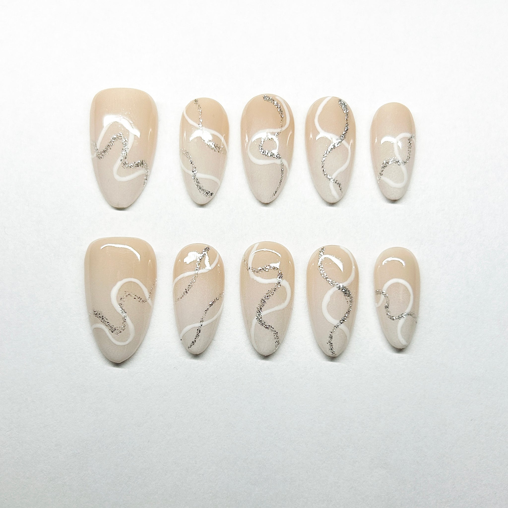 Introducing our exquisitely minimalist and effortlessly elegant press-on nail set. This set showcases a serene sheer nude base, beautifully adorned with delicate, free-flowing abstract swirls in both crisp white and sparkling silver. The silver lines are infused with a subtle, shimmering glitter, adding an ethereal touch of luminescence.